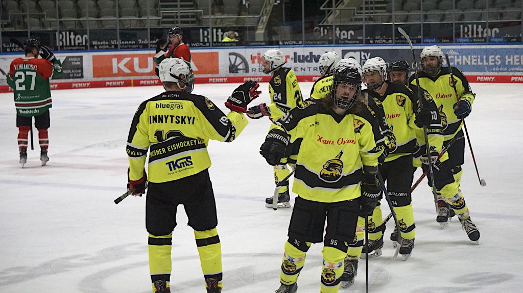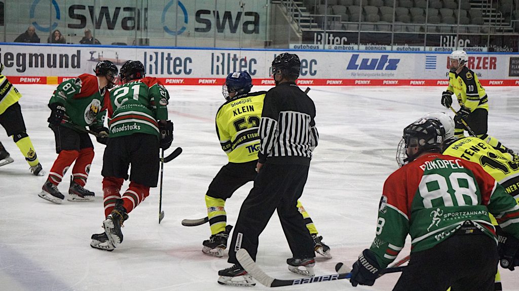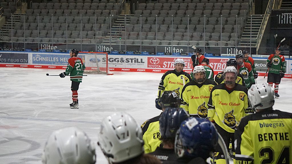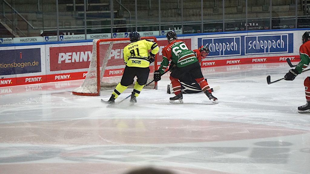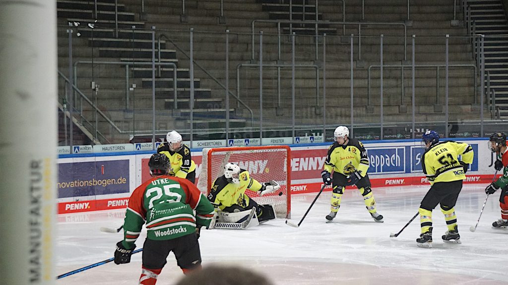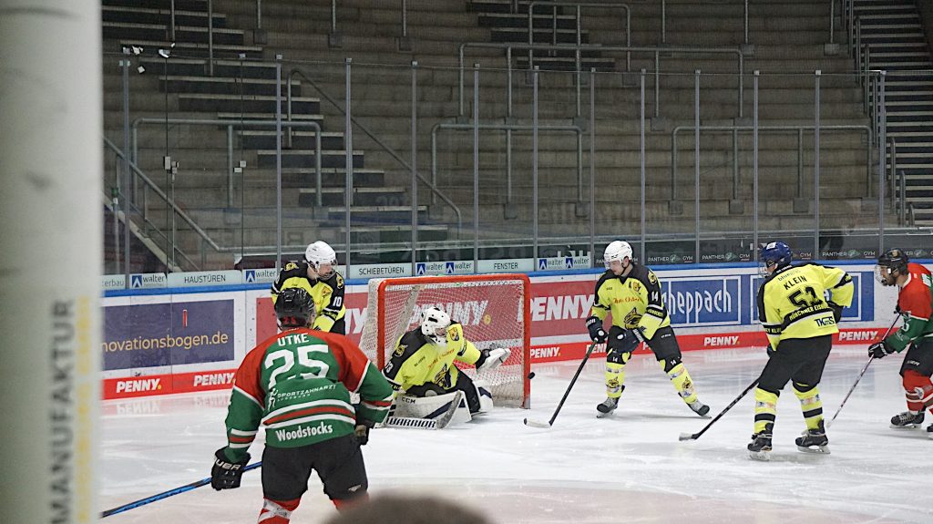 Nach etwa zehn Minuten kam auch die Offensive der Gäste langsam in Fahrt. Die Woodstocks zeigten sich anfällig für schnelle Gegenangriffe, und die Luchse machten sich diese Schwachstelle schnell zu Nutzen. Die aufgrund des verletzungsbedingten Ausfalls von Edgars Opulskis neu formierte erste Reihe der Münchner konnte sich zwei absolute Hochkaräter erarbeiten. Zunächst überlief Yehor Vinnytskyi auf dem rechten Flügel all seine Gegenspieler, hob den Puck allerdings mit der Rückhand über das gegnerische Tor. Wenig später fuhr Felix Klein einen fast komplett identischen Angriff. Der im Nachwuchs des Augsburger EV ausgebildete Felix sprintete ebenfalls über die rechte Seite auf den gegnerischen Torhüter zu, scheiterte aber mit seinem Rückhandschuss an Torwart Davide Olivieri. Bitter für Felix, der die große Chance hatte, bei der Rückkehr in sein ehemaliges Wohnzimmer auf vertrautem Eis ein Tor zu bejubeln. So blieb es jedoch nach zwanzig Minuten bei einem torlosen Unentschieden.