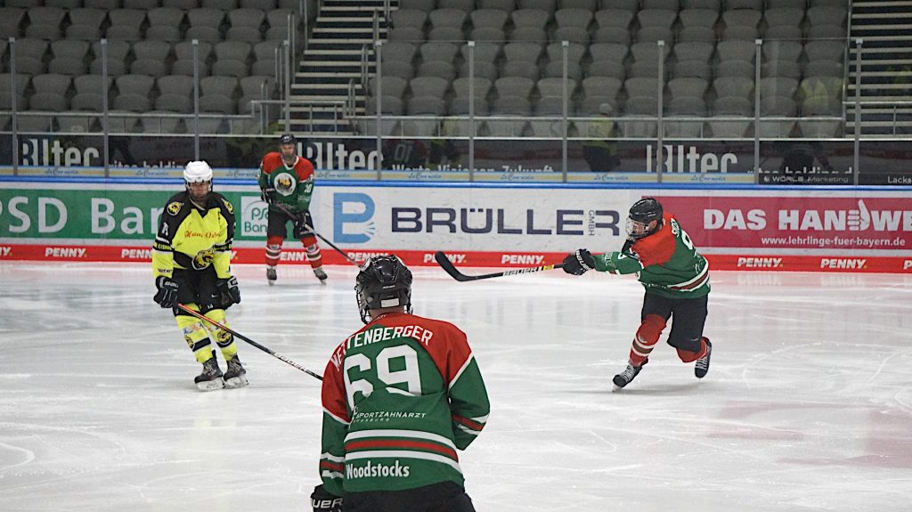 Die Gastgeber zeigten sich zunächst unbeeindruckt vom Rückstand. Nur wenige Sekunden nach seinem Tor zum 0-2 musste Tobias Treichl auf der Strafbank Platz nehmen. Die Woodstocks schnürten ihre Gegner im eigenen Drittel ein, bis die Stunde von Maximilian Merkel schlug. Normalerweise glänzt der frühere Bayernligaspieler mit seinen begnadeten Händen, seinem hohen Eishockey-IQ und einem strammen, zielsicheren Handgelenkschuss. Diesmal machte er sich jedoch vor dem gegnerischen Tor die Finger schmutzig. Tamino Kaut ließ einen Schuss auf sein Tor prallen, Merkel setzte sich gegen die Münchner Hintermannschaft durch und drückte den Nachschuss zum 1-2 Anschlusstreffer über die Linie. Während der Augsburger Spielertrainer den Anschlusstreffer mit seinen Mannschaftskollegen bejubelte, wurden bei den Landeshauptstädtern unangenehme Erinnerungen an die letztjährige Schlussphase in Augsburg wach.
