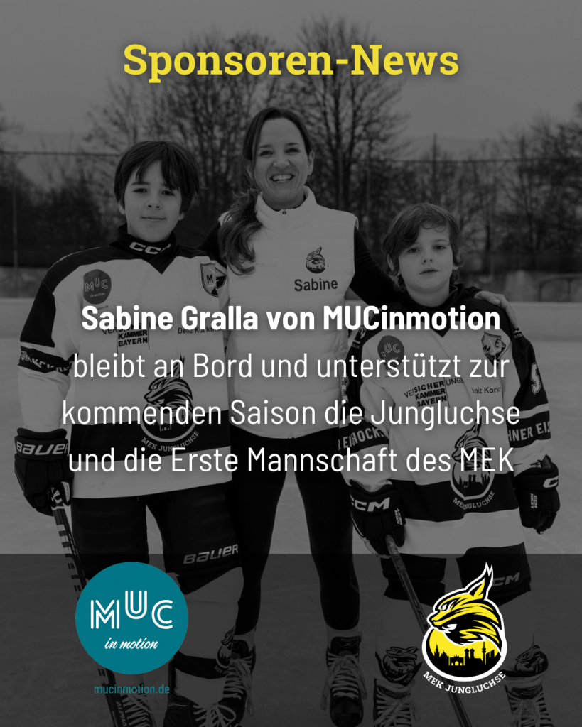 Mindestens genauso engagiert ist Sabine rund um das Eisstadion. Sabine ist in der Nähe der Eishockeyhochburg Düsseldorf groß geworden und ist von Kindesbeinen an Eishockeyfan. Sie selbst hat zwar nie gespielt, dafür konnte sie die Leidenschaft für den schnellsten Mannschaftssport der Welt jedoch an ihren Sohn weitergeben, der für die MEK Jungluchse aufs Eis geht. In ihrem ersten Jahr beim MEK trat Sabine nicht nur als Eishockeymama auf, sondern unterstützte den Verein beim Launch der Nachwuchsabteilung. Das tat sie nicht nur als Athletiktrainerin und On-Ice-Helferin der Münchner U11, sondern auch als Sponsorin des ersten Trikotsatzes der Jungluchse. Somit trug sie einen wesentlichen Teil zu dem erfolgreichen Start der MEK-Nachwuchsabteilung bei. Sehr zu unserem Glück fühlt sich Sabine bei den Luchsen sehr wohl und kam zu Anfang des Kalenderjahres mit guten Nachrichten auf uns zu. Sie möchte nicht nur weiter die Jungluchse unterstützen, sondern auch bei der Ersten Mannschaft der Landeshauptstädter präsent sein. Somit wird das Logo von MUCinmotion zur Saison 2026/27 sowohl die Trikots der Nachwuchsmannschaften U11 bis U15, als auch die Stutzen der Feldspieler der Ersten Mannschaft des MEK zieren. Außerdem wird sie ihre berufliche Expertise im Sommertraining einbringen und die Jungluchse mannschaftsübergreifend fit für die Eiszeit machen. Wenn ihr mehr über Sabine erfahren wollt, stattet ihr gerne einen Besuch unter https://www.mucinmotion.de/ oder auf https://www.instagram.com/mucinmotion_sabinegralla/ ab!
